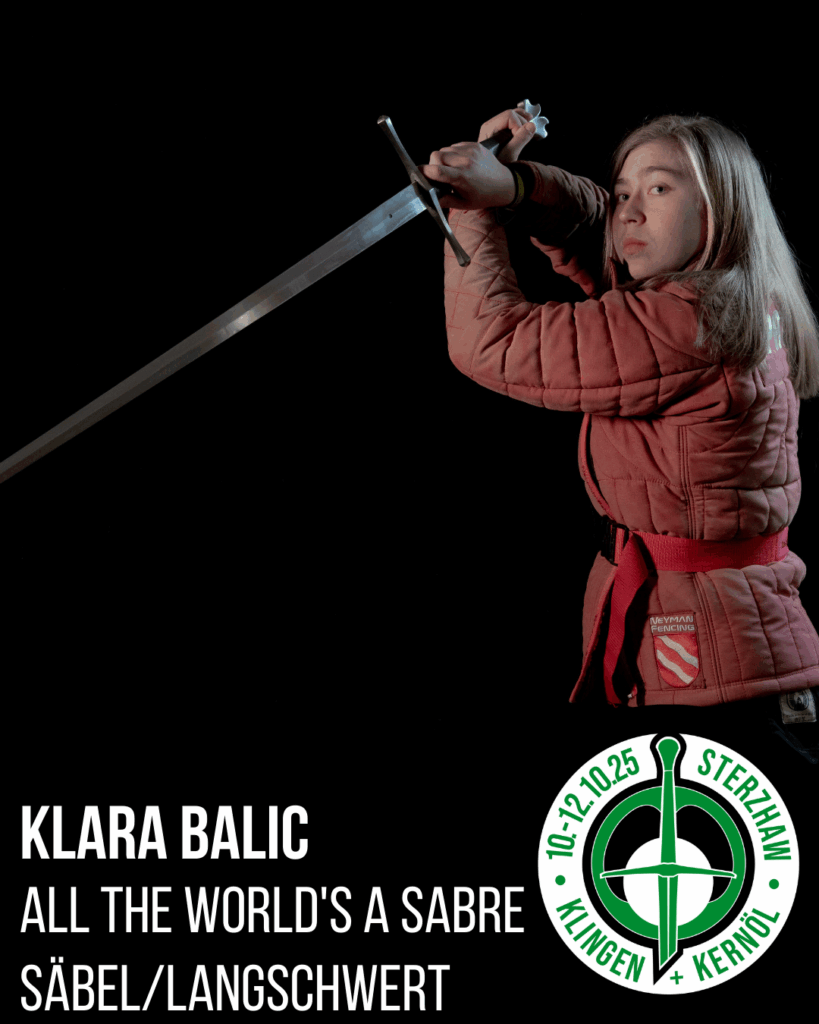 Klara Balic begann 2016 mit HEMA bei INDES Graz und war später u. a. bei Lyon AMHE aktiv. Heute trainiert sie bei Ochs München, hauptsächlich mit dem langen Schwert – probiert aber auch gerne Neues aus. Besonders begeistert sie an HEMA die offene, informelle Forschungs- und Sportgemeinschaft, die immer wieder spannende Persönlichkeiten zusammenbringt.